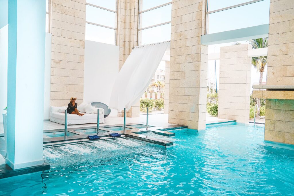 The hydrotherapy circuit allows guests to move through various pools, steam rooms, and relaxation areas. This example demonstrates how Beloved Playa Mujeres integrates wellness into the overall vacation experience, offering health benefits while promoting relaxation.